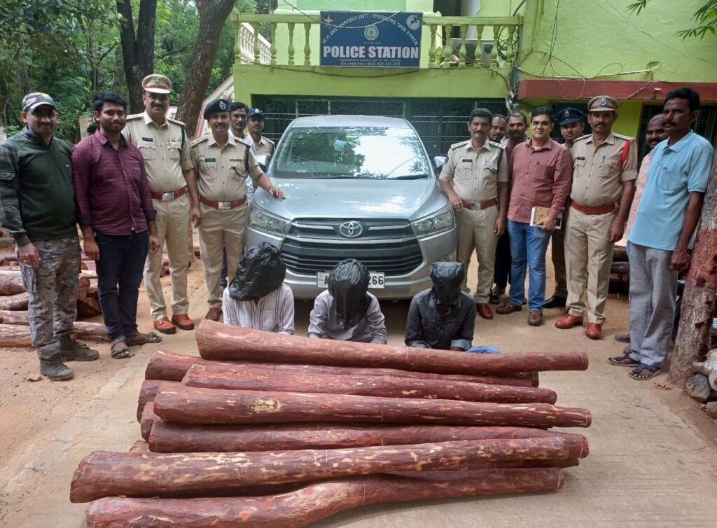 Task Force police arrested three red sanders smugglers in the forest area of C.K. Dinne mandal under Kadapa forest division. They seized 26 red sanders logs and a car from them. Notably, the smugglers had taken the car on self-drive rental and used it for transporting the red sanders illegally.