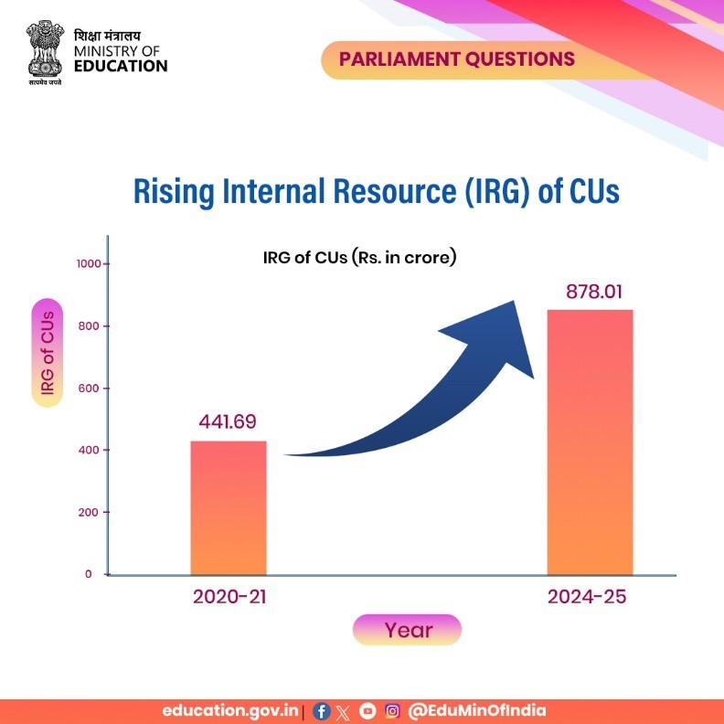 కేంద్ర విశ్వవిద్యాలయాల అంతర్గత ఆదాయం గణనీయంగా పెరిగిందని తాజా గణాంకాలు సూచిస్తున్నాయి. Internal Resource Generation (IRG) of Central Universities has significantly increased in recent years.