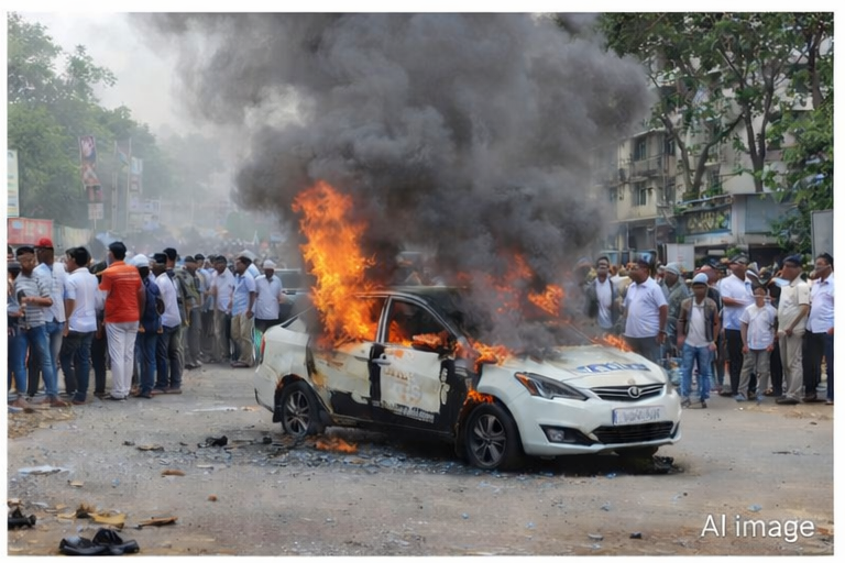 As Congress workers attempted to march towards the MLA’s camp office, police intervened and detained several protesters. BJP supporters also gathered on the roads, and during the unrest a car was vandalised and set on fire, escalating the situation. Police dispersed both groups and increased security across the town.