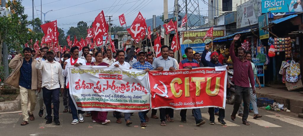 అరకులోయ మండల కేంద్రంలో బుధవారం నిర్వహించిన సమ్మెకు భారీ స్పందన లభించింది. సిఐటియు ఆధ్వర్యంలో దేశవ్యాప్తంగా కార్మిక సంఘాలు చేపట్టిన సమ్మె లో భాగంగా, అరకులోయలోని పర్యాటక కేంద్రాలు పూర్తిగా మూతపడ్డాయి. పెట్రోల్ బంకులు పని చేయలేదు. సిఐటియు మండల కార్యదర్శి జన్ని భగత్ రామ్ ఆధ్వర్యంలో జరిగిన సమ్మెలో, సిఐటియు జిల్లా ప్రధాన కార్యదర్శి ఉమామహేశ్వరరావు మాట్లాడుతూ — కార్మికుల హక్కులు తొలగించే నూతన లేబర్ కోడ్స్ ను రద్దు చేయాలని కేంద్ర ప్రభుత్వాన్ని ఒత్తిడికి గురిచేయాల్సిన అవసరం ఉందన్నారు.