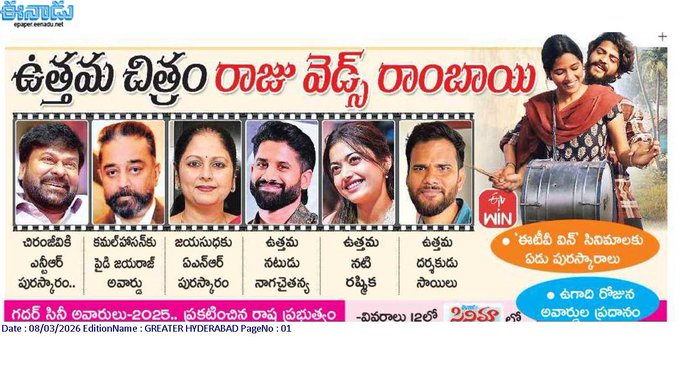 The Telangana Government announced the Gaddar Film Awards 2025 recognising artists and technicians from various fields of the film industry.