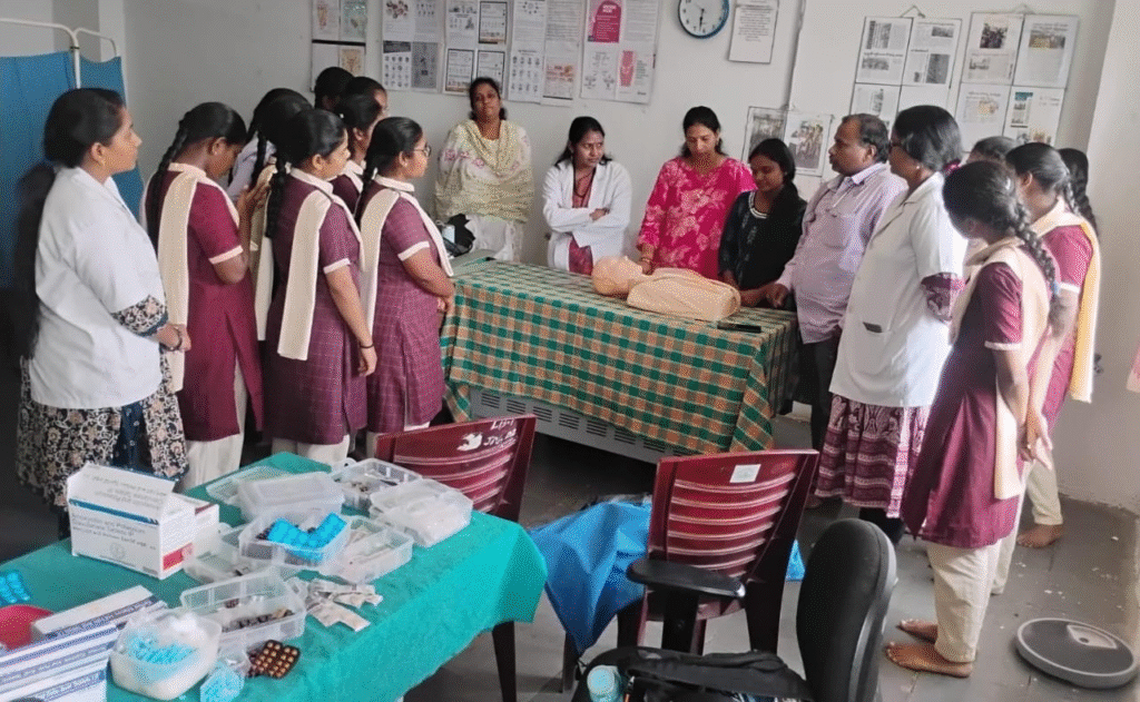 Doctors including Dr. V. Shobha, Dr. Santosh Kumar, and Dr. Jyothi participated in the program. Student leaders Deepthi, Harshitha, and Nakshatra actively supported the initiative.