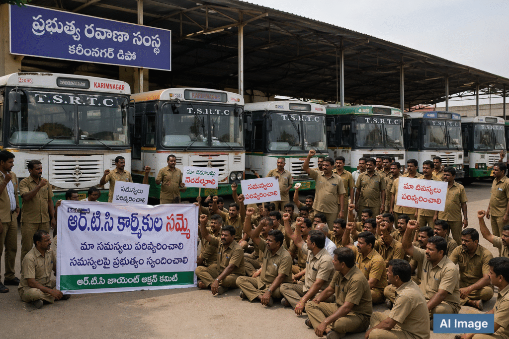 RTC workers staged protests in front of depots across several districts, demanding immediate resolution of their long-pending issues. In the combined Karimnagar district alone, more than 1,000 buses across 11 RTC depots remained off the roads.