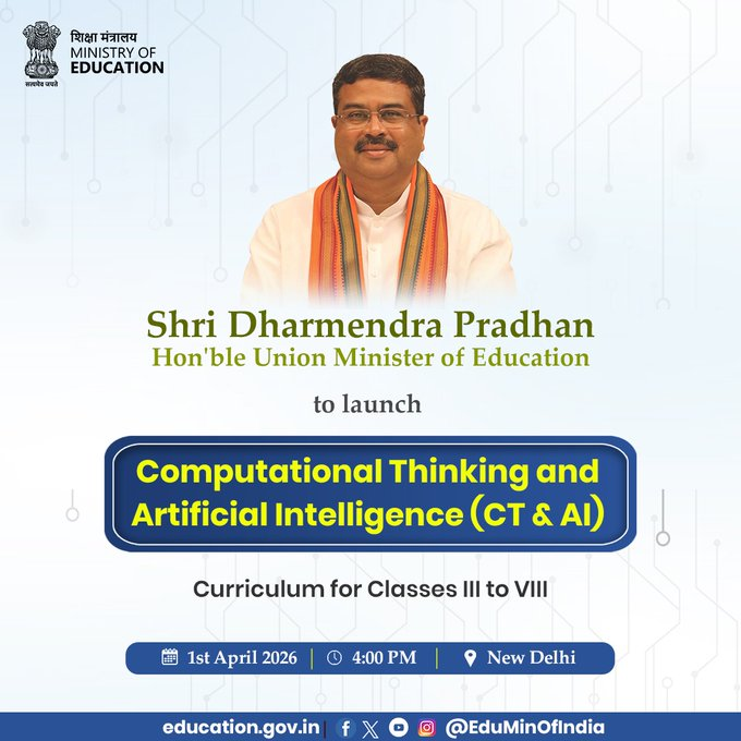 న్యూఢిల్లీ కేంద్రంగా విద్యా రంగంలో కీలక నిర్ణయం తీసుకున్నారు. కేంద్ర విద్యాశాఖ మంత్రి ధర్మేంద్ర ప్రధాన్ ఏప్రిల్ 1న తరగతులు 3 నుంచి 8 వరకు కంప్యూటేషనల్ థింకింగ్ మరియు కృత్రిమ మేధస్సు (AI) పాఠ్యాంశాన్ని ప్రారంభించనున్నారు.