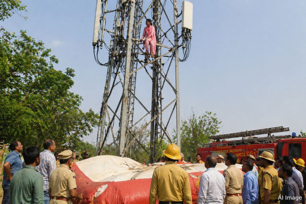 The incident took place in Barman village under Hathras Junction Police Station limits. Pooja (30), wife of Yashpal, reportedly left her in-laws’ house suddenly and reached Lutsan Road, where she climbed a mobile tower and sat at the top.