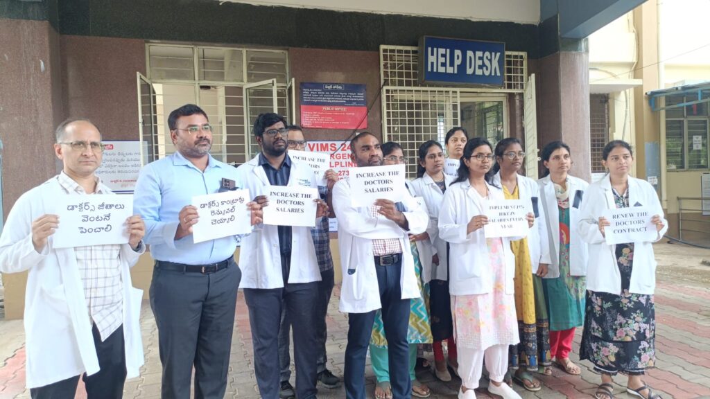 విశాఖపట్నం విమ్స్ హాస్పిటల్ లో గురువారం ఉదయం 9 గంటల నుంచి మధ్యాహ్నం 11 గంటల వరకు తమ మౌన నిరసన తెలియజేశారు. అసిస్టెంట్ ప్రొఫెసర్ గా విధుల్లో చేరి మూడేళ్లు దాటిన 92,000 జీతానికే విధులు నిర్వహిస్తున్నామని, కాంట్రాక్టర్ పద్ధతిలో ఆంధ్రప్రదేశ్లో పలాస కిడ్నీ హాస్పిటల్ లో విధులు నిర్వహిస్తున్న వైద్యులకు దాదాపు లక్ష 60,000 ఇస్తున్నారని అదే క్యాడర్ కు చెందిన తమకు మాత్రం 92000 ప్రభుత్వం ఇస్తుందని ఆవేదన వ్యక్తం చేశారు. ఇక పీజీ స్టూడెంట్స్ టైఫండ్ మాకంటే ఎక్కువ వస్తుంది అని అన్నారు మూడేళ్లు దాటినప్పటికీ రెన్యువల్ చేయలేదని భవిష్యత్తులో పెంచిన జీతాలతో కాంట్రాక్టు రెన్యూ చేయాలని విమ్స్ అసిస్టెంట్ ప్రొఫెసర్ కోరారు కోరారు. అయితే కేవలం ప్రభుత్వ దృష్టికి తెచ్చేందుకు మాత్రమే రెండు గంటల పాటు నిరసన వ్యక్తం చేస్తున్నామని 11 గంటలకు యధావిధిగా విధులు నిర్వహిస్తామని తెలియజేశారు. రోగులకు ఎటువంటి ఇబ్బందులు కలగకుండా విధులు నిర్వహిస్తున్నామని తెలిపారు.