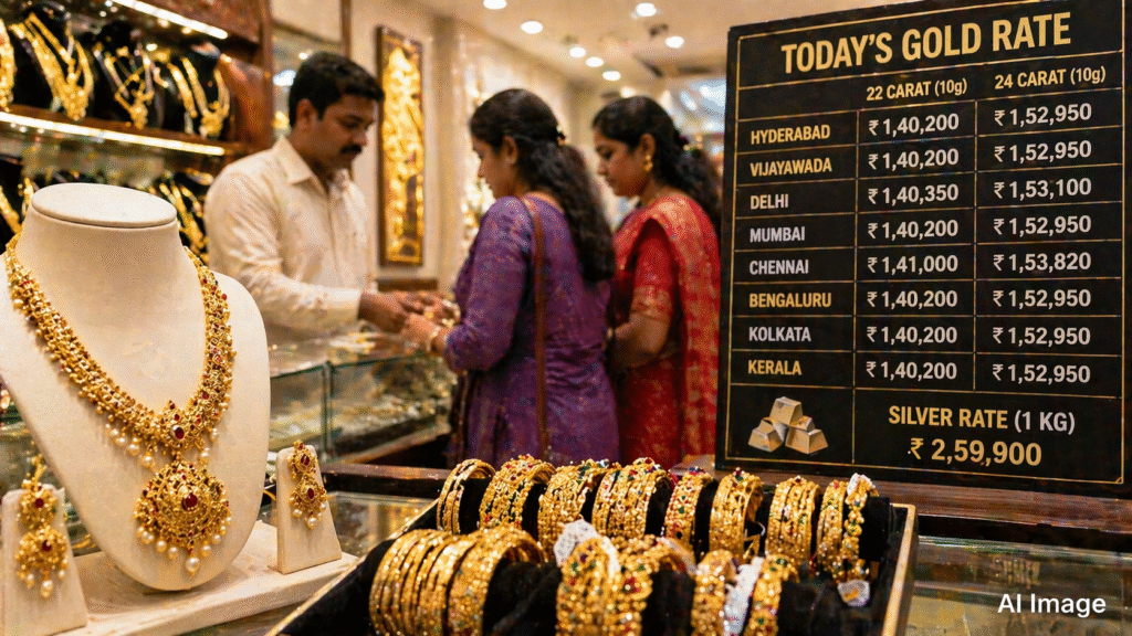 In Hyderabad, the price of 24-carat pure gold is currently at Rs 1,52,950 for 10 grams, while 22-carat gold is priced at Rs 1,40,200 for 10 grams. Compared to the previous day, 24-carat gold dropped by Rs 600 and 22-carat gold by Rs 550.