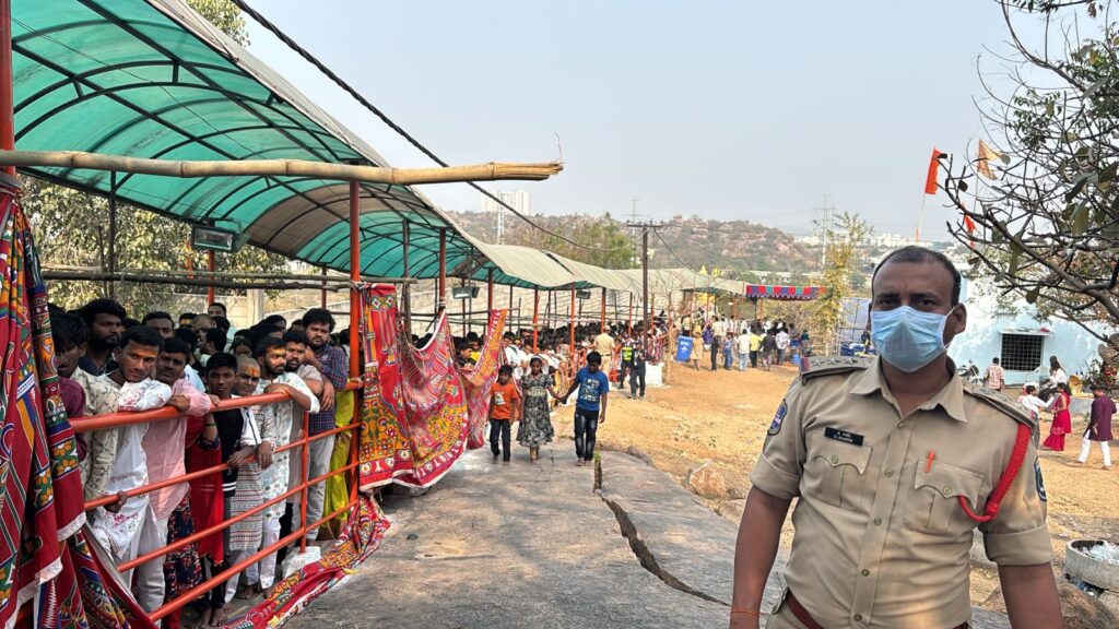 Cyberabad CP Dr. M. Ramesh visited the temple to review facilities, security arrangements, parking and traffic management. He also inspected bandobast arrangements in Narsingi, Beeranguda, KPHB and Isnapur areas.