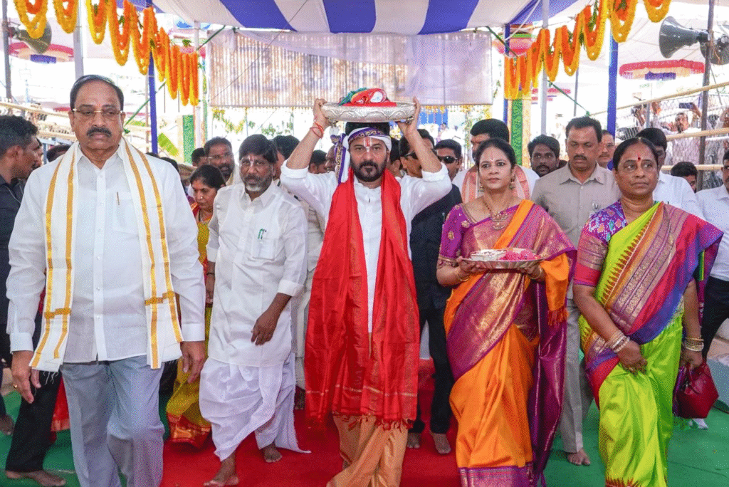 The ceremony, conducted at Mithila Stadium, witnessed the presence of Deputy Chief Minister Mallu Bhatti Vikramarka and ministers including Tummala Nageswara Rao, Konda Surekha, Ponguleti Srinivasa Reddy, Danasaari Anasuya Seethakka, and Vakiti Srihari, along with public representatives, senior officials, and a large number of devotees.