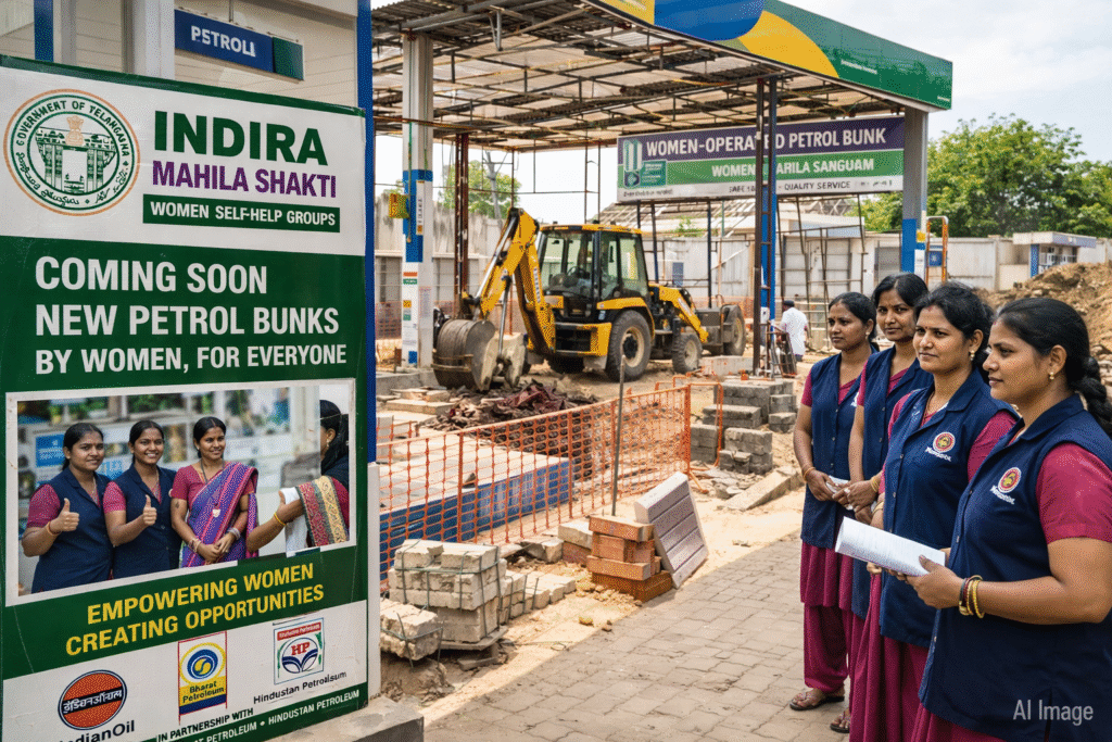 The Telangana government is accelerating efforts to economically empower women through employment opportunities. Under the Indira Mahila Shakti scheme, petrol bunks are being allotted to women self-help groups, where all roles—from staff to ownership—will be managed by women.