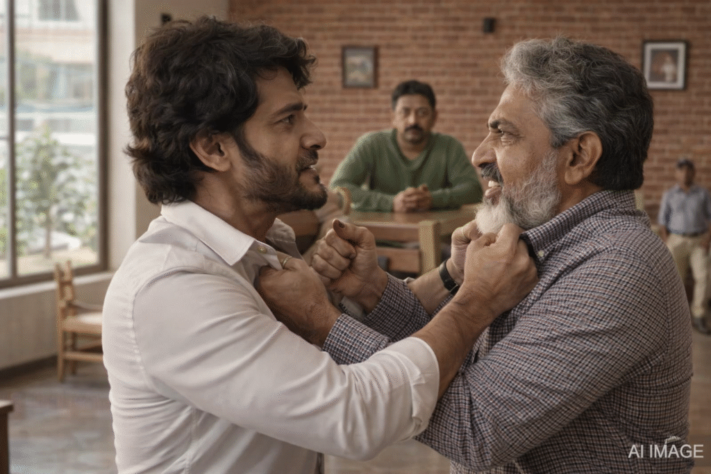 The clip depicts Mahesh Babu and Rajamouli grabbing each other’s collars in a heated exchange. However, it is not a real incident but an AI-generated visual created using advanced technology.