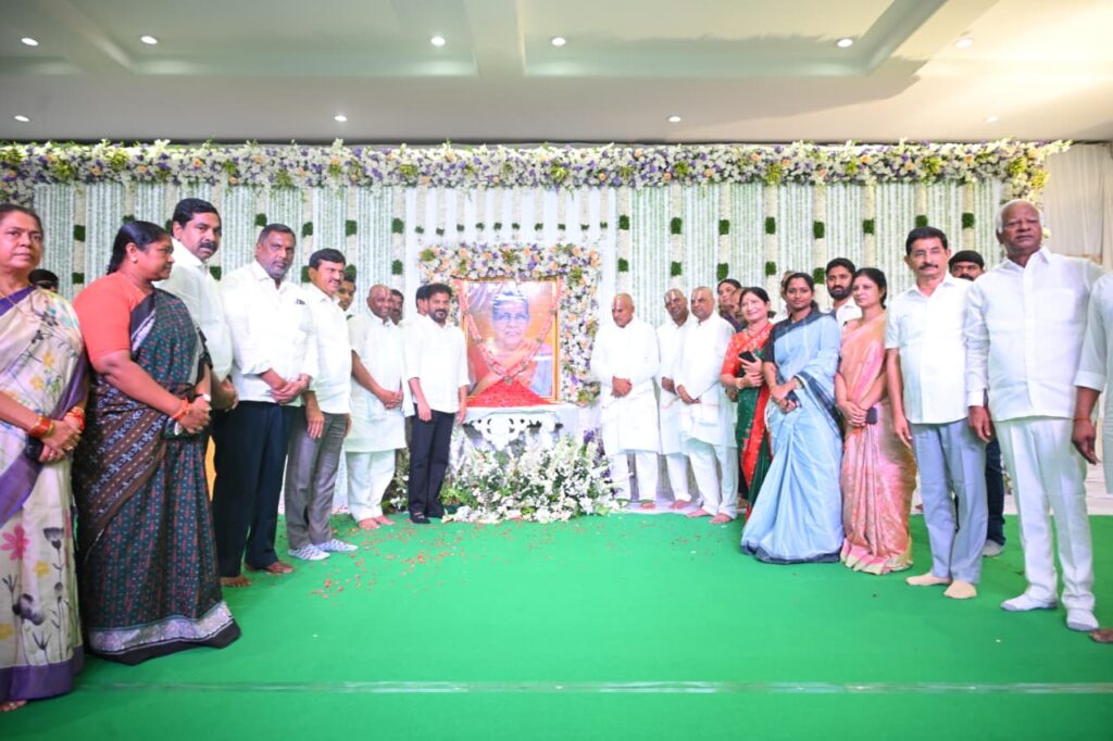 The 10th-day ceremony of Narsampet MLA Donthi Madhava Reddy’s mother Kanthamma was held at Vaddepalli in Hanumakonda district. Telangana Chief Minister Revanth Reddy attended the event and paid floral tributes to Kanthamma’s portrait. He expressed his condolences to Madhava Reddy and his family members. Several ministers, public representatives, and local leaders were also present at the ceremony and paid their respects.