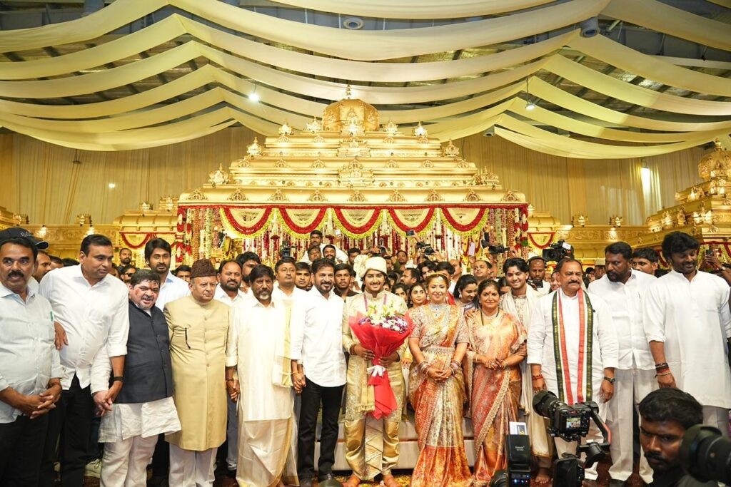 The grand wedding in Hyderabad saw Chief Minister Revanth Reddy as the chief guest, blessing the couple and spending time with the Bhatti Vikramarka family. Ministers, political figures, and social dignitaries attended the event to convey their congratulations.