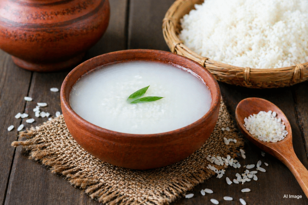 During summer, the body loses water and essential minerals through sweating. Drinking rice water with a small amount of salt helps maintain electrolyte balance and protects the body from dehydration.