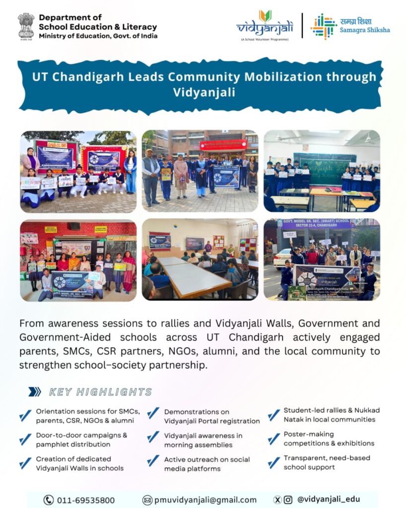 Chandigarh లో విద్యాంజలి కార్యక్రమం (#Vidyanjali) ద్వారా పాఠశాల–సమాజ భాగస్వామ్యాన్ని బలోపేతం చేసే దిశగా విస్తృత కార్యక్రమాలు నిర్వహించారు. యూటీ చండీగఢ్ పరిధిలోని అన్ని ప్రభుత్వ మరియు ప్రభుత్వ అనుబంధ (ఎయిడెడ్) పాఠశాలలు ఈ కార్యక్రమంలో చురుకుగా పాల్గొన్నాయి.