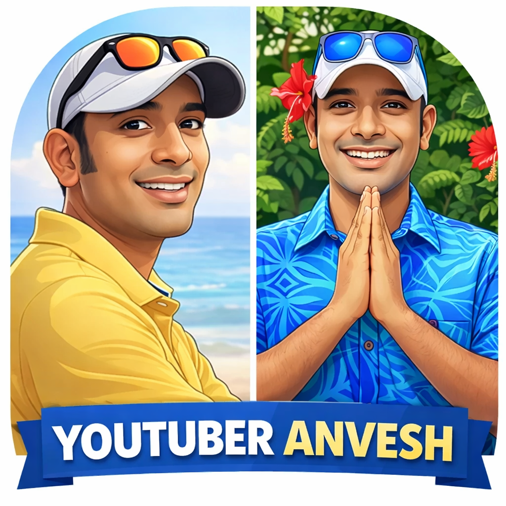 This AI-generated digital illustration features YouTuber Anvesh in a creative split-frame design showcasing two different looks. On the left side, he is seen wearing a yellow shirt and white cap with sunglasses, posing against a beach background. On the right side, he appears in a blue tropical shirt with a white cap and sunglasses, smiling with folded hands in a “namaste” gesture, set against a lush green backdrop with red flowers.