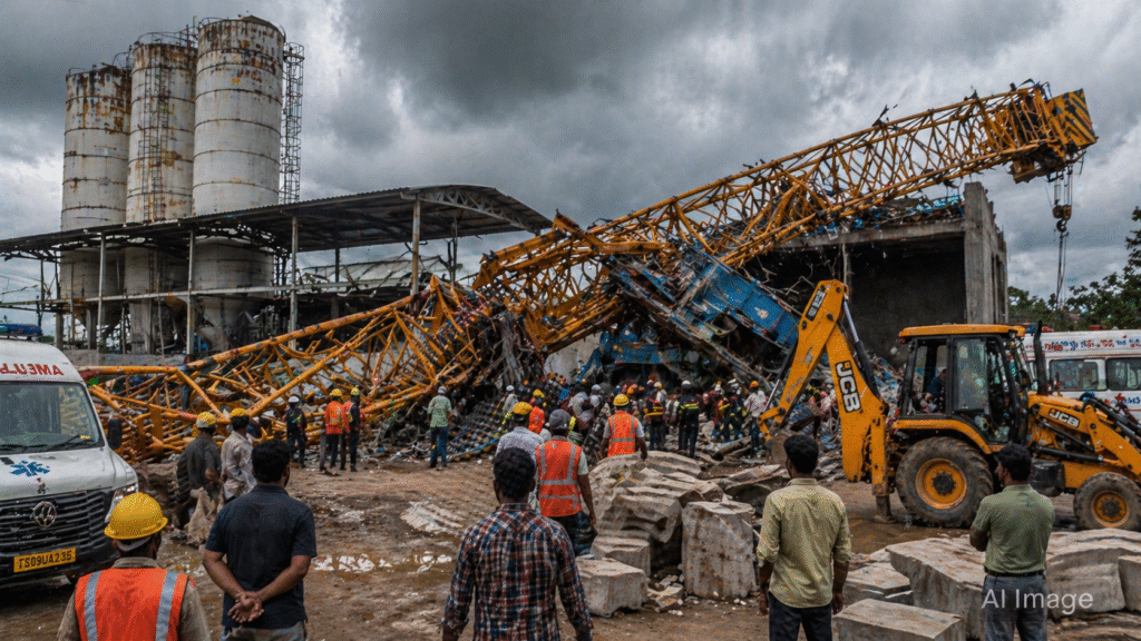 A tragic industrial accident occurred in Shankarpally mandal of Rangareddy district on the outskirts of Hyderabad, where five workers lost their lives after a massive crane collapsed at an NCC cement brick manufacturing unit in Mahalingapuram village.