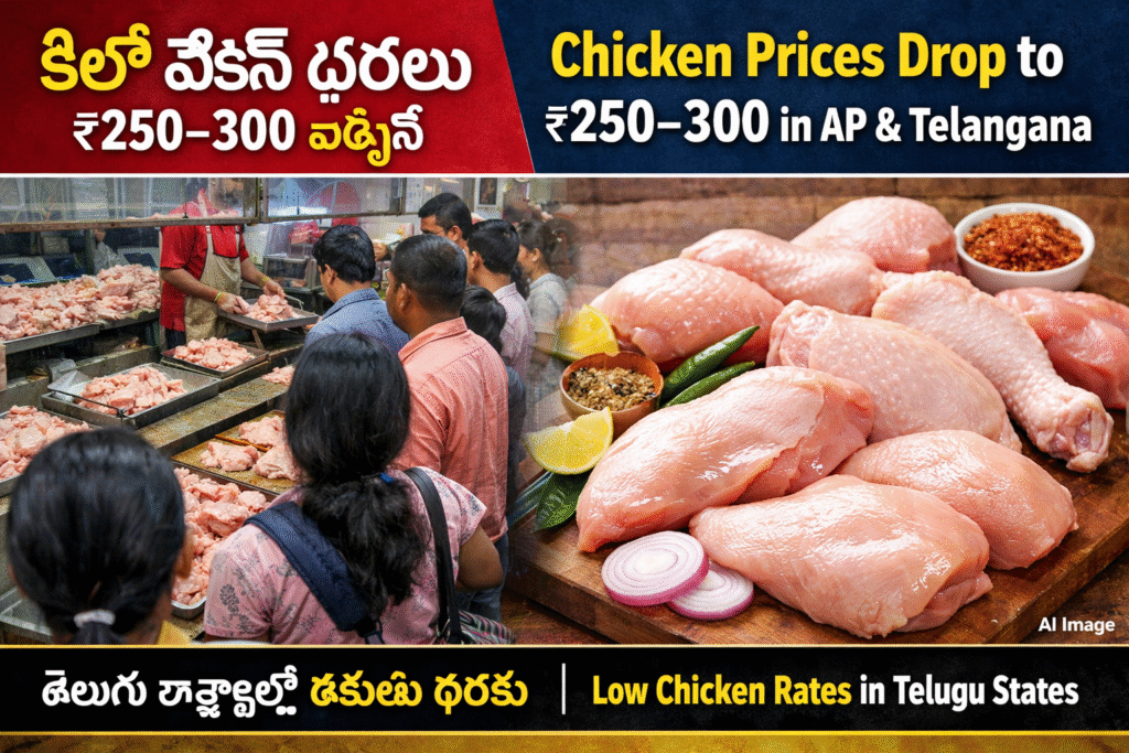 Chicken prices fall across AP & Telangana. తాజా రేట్లు ₹250–300 మధ్య. పూర్తి వివరాలు తెలుసుకోండి.