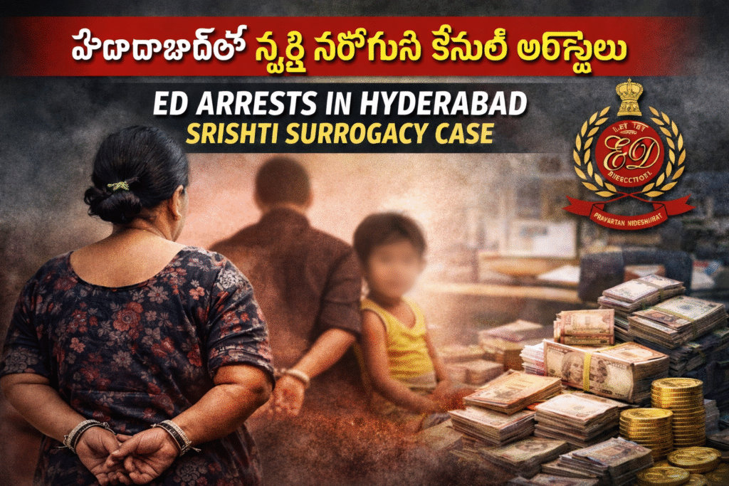 In Hyderabad, the ED has arrested Dr. Namrata and her son in the Srishti surrogacy case. They are accused of purchasing infants from tribal families and running a multi-crore fraud under the guise of surrogacy, with a money laundering probe underway.