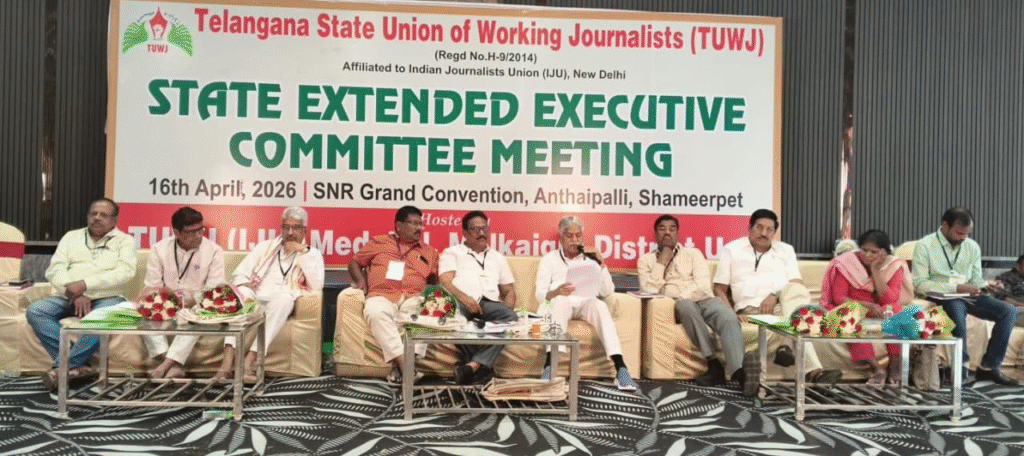 Telangana Media Academy Chairman Srinivas Reddy clarified the government’s stance on issuing accreditation cards to journalists. He was speaking at the TUWJ (IJU) state executive meeting held at SNR Pushpa Convention Hall in Anthaipally, Shamirpet, Medchal district.