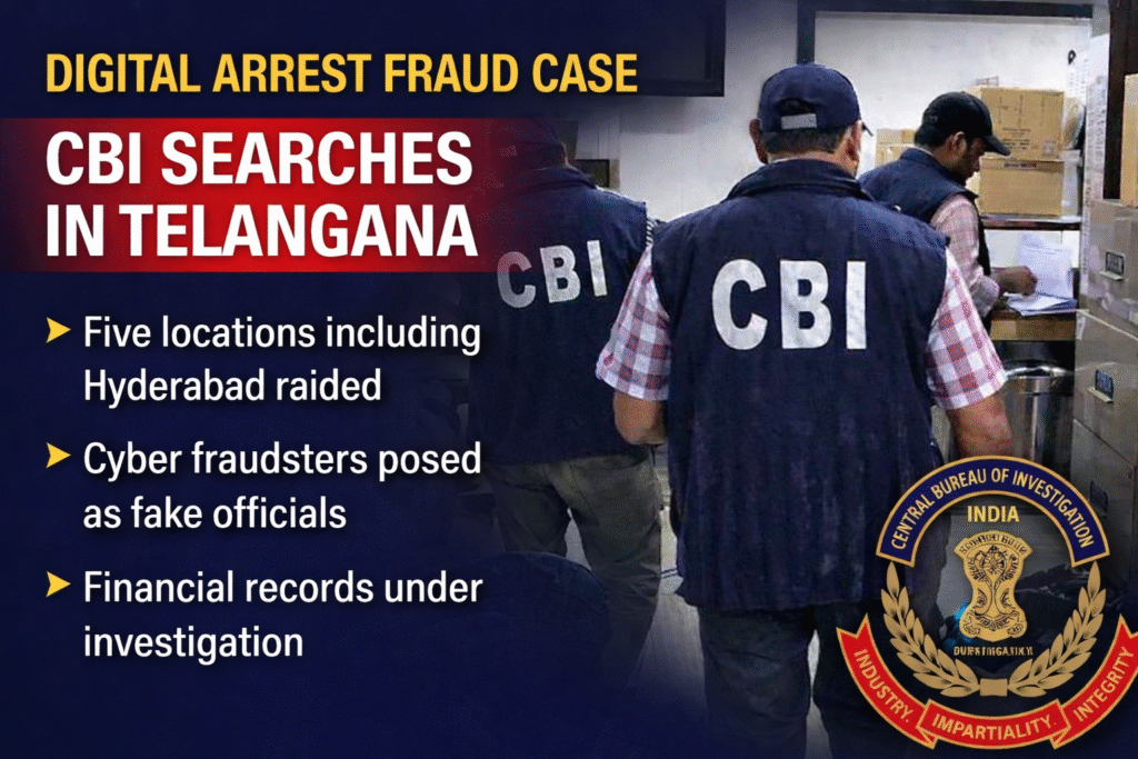 The Central Bureau of Investigation (CBI) conducted coordinated searches across multiple locations in Telangana and Andhra Pradesh in connection with a major digital arrest fraud case. The searches were carried out in Hyderabad and several other locations as part of a wider cybercrime investigation.
