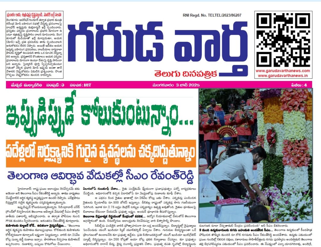 • E NEWS PAPER 3RD JUNE 2025 GARUDA VARTHA PUBLISHED & PRINTED IN TELUGU LANGUAGE FROM TELANGANA STATE