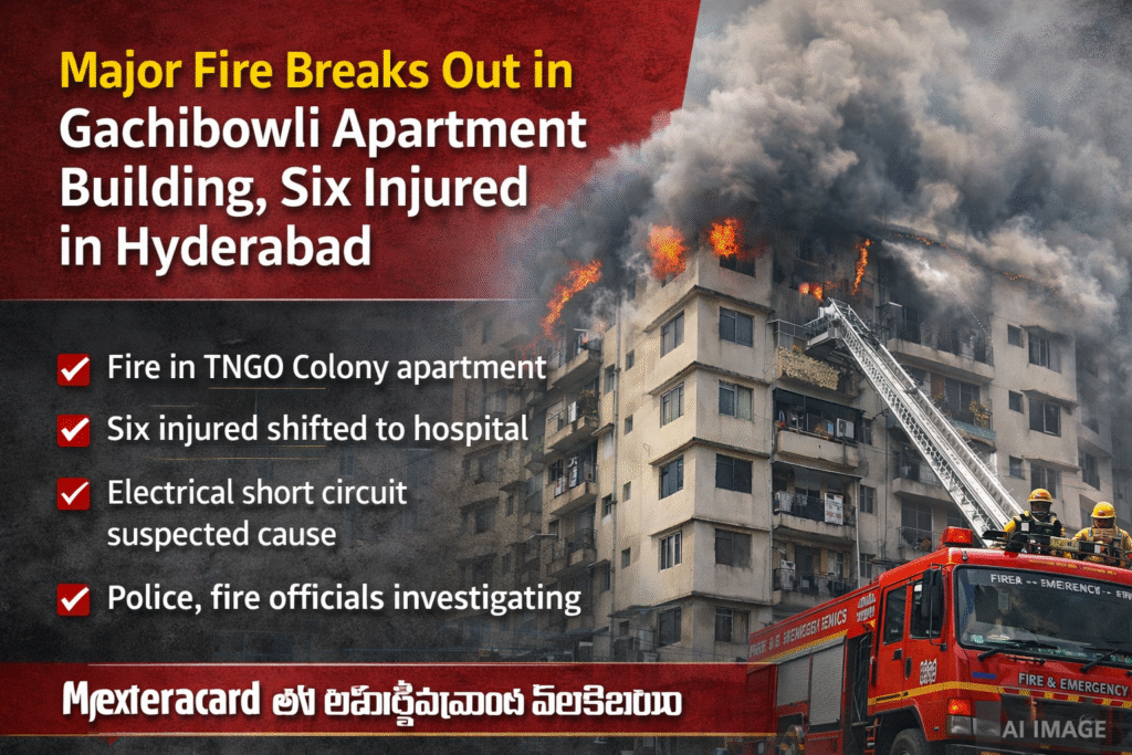 A major fire broke out in an apartment building located in TNGO Colony, Gachibowli, Hyderabad, on Monday morning, causing panic among residents and leaving six people injured.