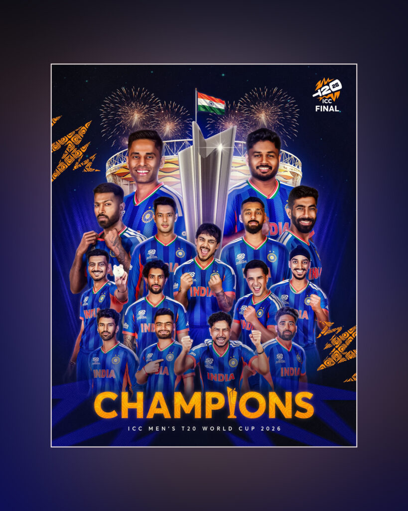 భారత్ జట్టు ఐసీసీ పురుషుల టీ20 ప్రపంచకప్లో మూడోసారి విజేతగా నిలిచి చరిత్ర సృష్టించింది. న్యూజిలాండ్ను ఫైనల్లో ఓడించి టీమ్ ఇండియా మరోసారి ప్రపంచ ఛాంపియన్గా అవతరించింది. | India scripted history by winning the ICC Men’s T20 World Cup for the third time, defeating New Zealand in a thrilling final to become world champions again.