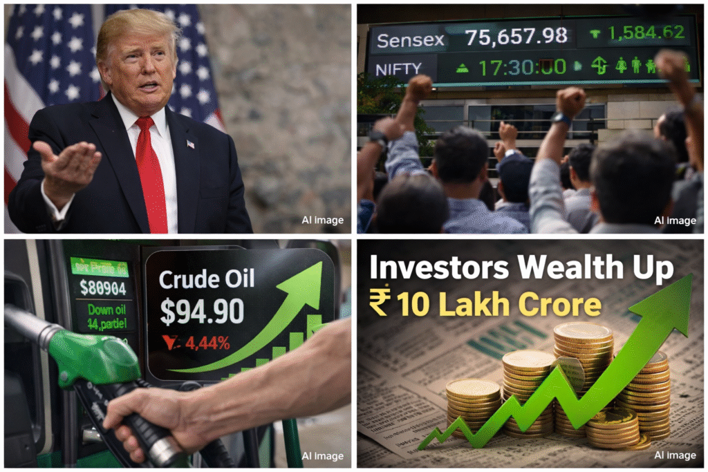 Donald Trump’s recent remarks eased global geopolitical concerns, leading to a sharp fall in crude oil prices and triggering a strong rally in Indian stock markets, significantly boosting investor wealth.