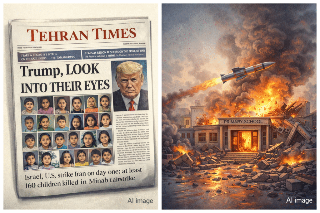 ఇరాన్లోని మినాబ్ పట్టణంలో జరిగిన క్షిపణి దాడిలో మరణించిన చిన్నారుల ఫోటోలతో టెహ్రాన్ టైమ్స్ పత్రిక ఫ్రంట్పేజ్ను ప్రచురిస్తూ అమెరికా మాజీ అధ్యక్షుడు డొనాల్డ్ ట్రంప్పై తీవ్ర విమర్శలు చేసింది. Tehran Times published the photos of children killed in a missile strike in Iran’s Minab town with the headline asking Donald Trump to “look into their eyes,” highlighting the tragedy and raising questions over responsibility.